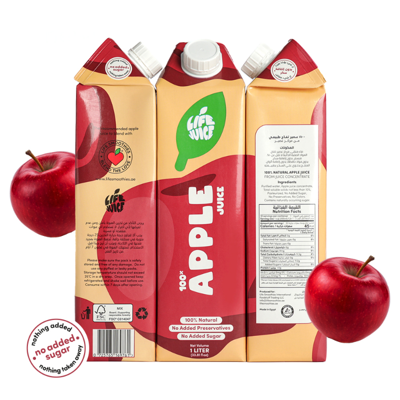 Introducing Life apple juice, the perfect complement to Life Smoothies’ pre-portioned frozen DIY smoothie mixes or a delightful standalone beverage . Made with 100% natural ingredients sourced from the lush orchards of Egypt, Life Juice Apple Juice enhances any experience with its crisp and refreshing taste whether blended or enjoyed independently.
