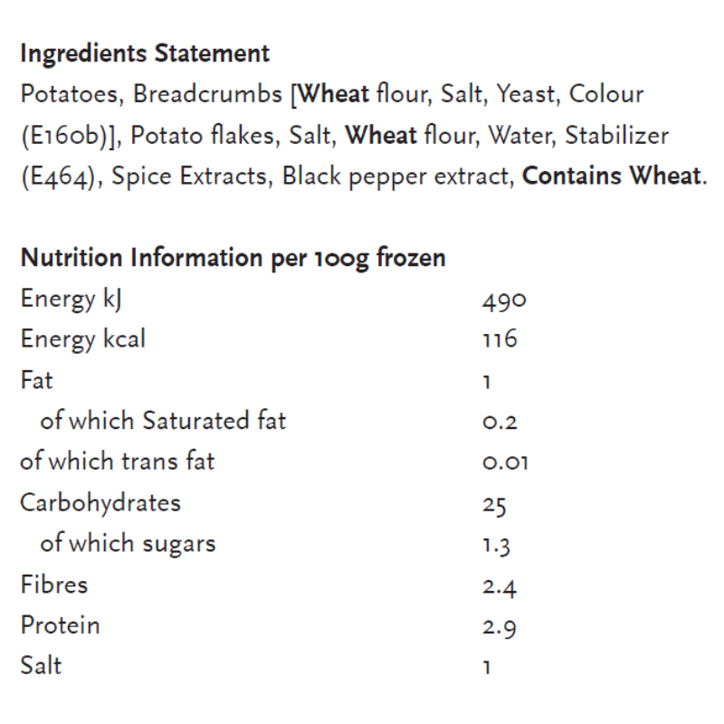 Cooking appliances may vary, therefore cooking time may need to be adjusted from the guidelines as labeled. For best results, always cook from frozen (deep fry: ± 3-4 min. 175°C). If allowed to defrost the product (store below 7°C), adjust cooking time accordingly (shorter times). Do not overcook.
