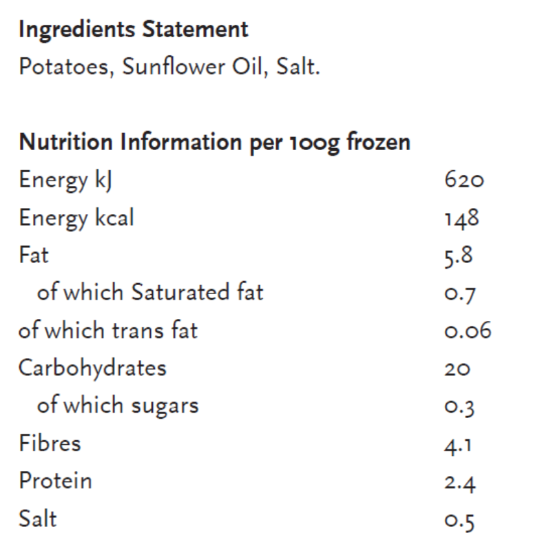 Cooking appliances may vary, therefore cooking time may need to be adjusted from the guidelines as labeled. For best results, always cook from frozen (deep fryer:± 2:45 min. 175°C). If allowed to defrost the product (store below 7°C), adjust cooking time accordingly (shorter times). Do not overcook.