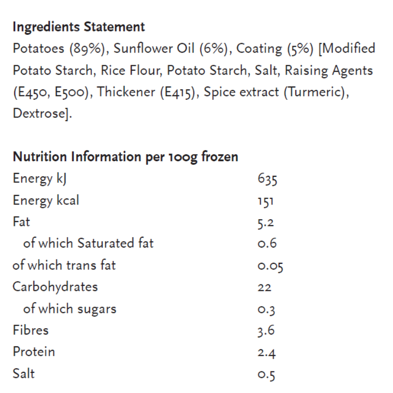 Cooking appliances may vary, therefore cooking time may need to be adjusted. For best results, always cook from frozen (fryer:± 3:15 min. 175°C or oven:± 15 to 20 min. 200°C). If allowed to defrost the product (store below 7°C), adjust cooking time accordingly (shorter times). Do not overcook.