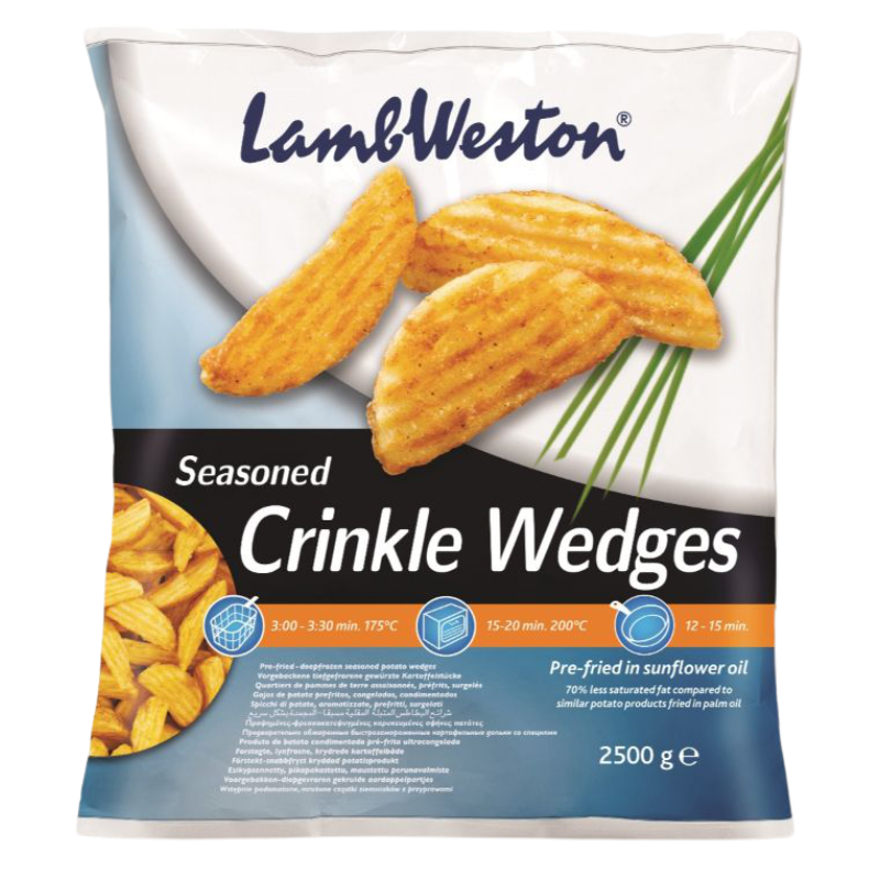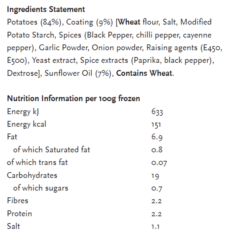 Cooking appliances may vary, therefore cooking time may need to be adjusted from the guidelines as labeled. For best results, always cook from frozen (fryer:± 3:15 min. 175°C or oven:± 15 to 20 min. 200°C). If allowed to defrost the product (store below 7°C), adjust cooking time accordingly (shorter times). Do not overcook.