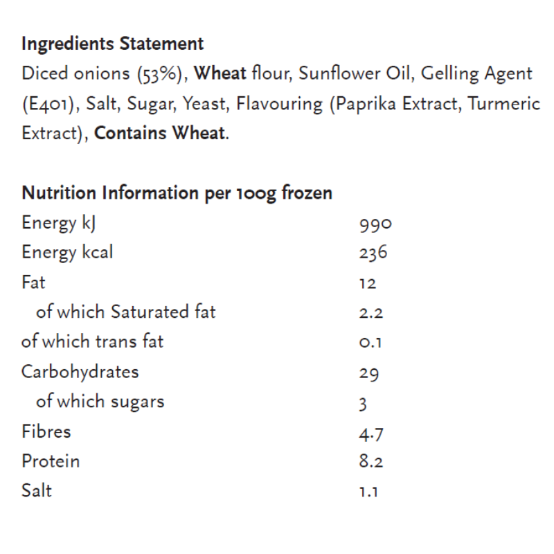 Smooth batter with diced onion, finished with delicious breading for that extra bite. As these rings are pre-formed for a uniform appearance, serving a perfect portion of luscious loops has never been easier! This often-ordered, golden-brown classic will do well on any menu.