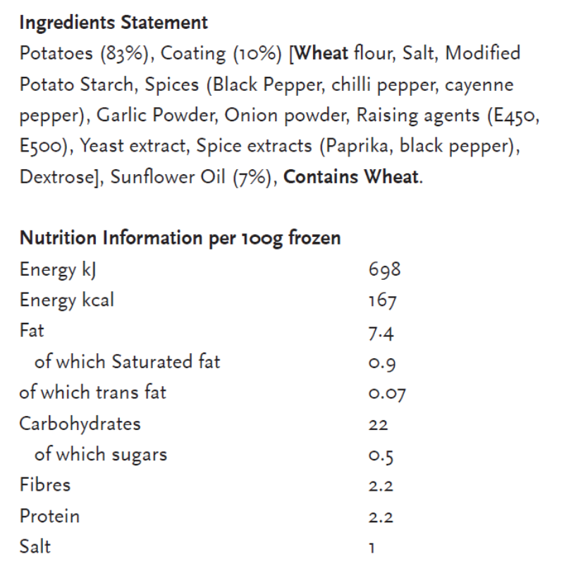 Cooking appliances may vary, therefore cooking time may need to be adjusted from the guidelines as labeled. For best results, always cook from frozen (deep fryer:± 3:15 min. 175°C or oven:± 15 to 20 min. 200°C). If allowed to defrost the product (store below 7°C), adjust cooking time accordingly (shorter times). Do not overcook.