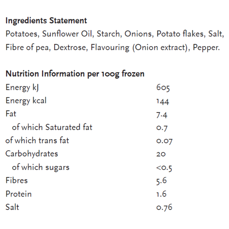 Cooking appliances may vary, therefore cooking time may need to be adjusted from the guidelines as labeled. For best results, always cook from frozen (deep fryer:± 3:30 min. 175°C or oven:± 15 to 20 min. 200°C). If allowed to defrost the product (store below 7°C), adjust cooking time accordingly (shorter times). Do not overcook.