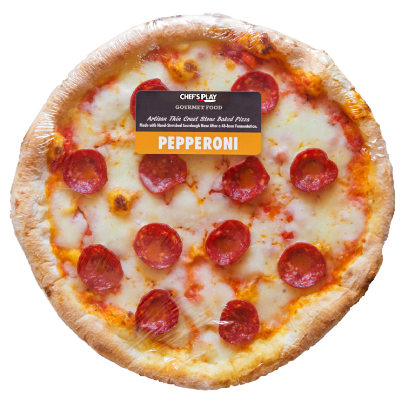 Rossa pizza base, mozzarella shredded, American pepperoni, chili flakes and extra virgin olive oil.