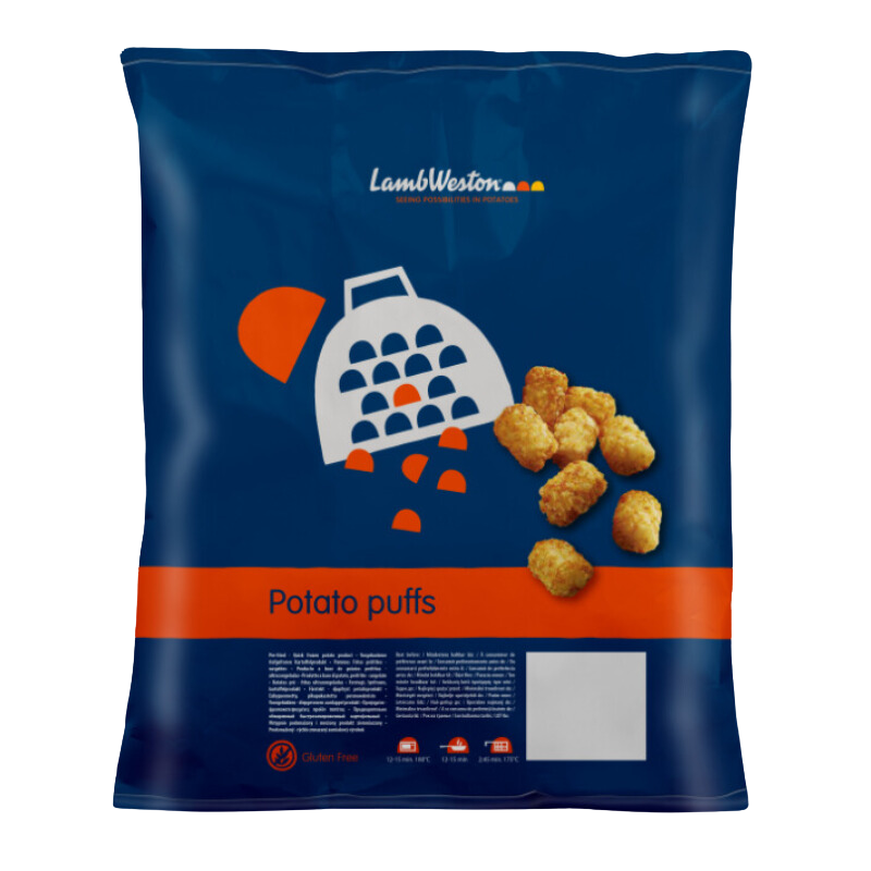 “Mini Hash Brown Puffs” from Lamb Weston are small, crispy potato puffs available in 1kg packs. They are used as a side dish or a snack and are designed to be easy to prepare and quick to cook, making them a popular choice in restaurants and kitchens.