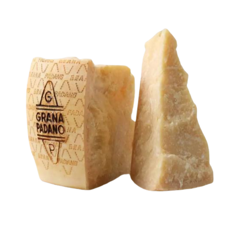 Grana Padano is a hard, granular Italian cheese made from cow’s milk and known for its distinct nutty and slightly sweet flavor. It’s aged for at least 10 months, which gives it a pale straw color and a firm, crumbly texture.