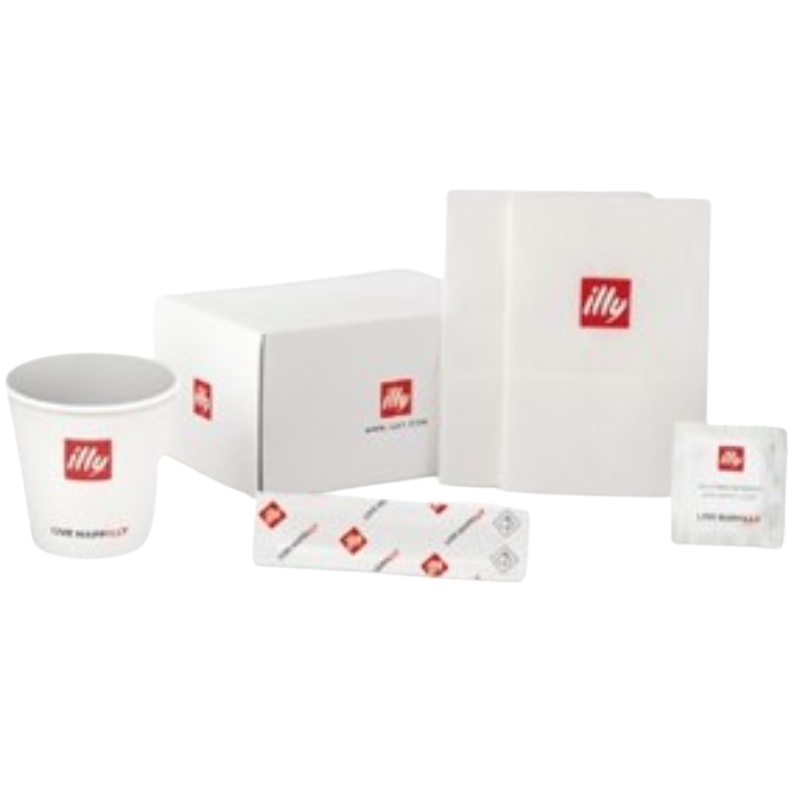 The illy Kit is the perfect solution for coffee lovers in office environments. This kit contains 200 servings of the renowned illy Italian coffee, known for its high quality and rich flavor. Designed for convenience, the kit allows each employee to prepare their favorite coffee quickly and easily with single-use portions. Additionally, the kit includes sugar packets and coffee stirrers, ensuring a complete and hassle-free coffee experience for everyone.