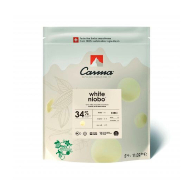 Carma White Niobo 34% Coins offer a creamy, sweet white chocolate flavor with a smooth texture. Made with 34% white cocoa, they are ideal for baking, coating, and melting. The 5kg package is perfect for large-scale use.