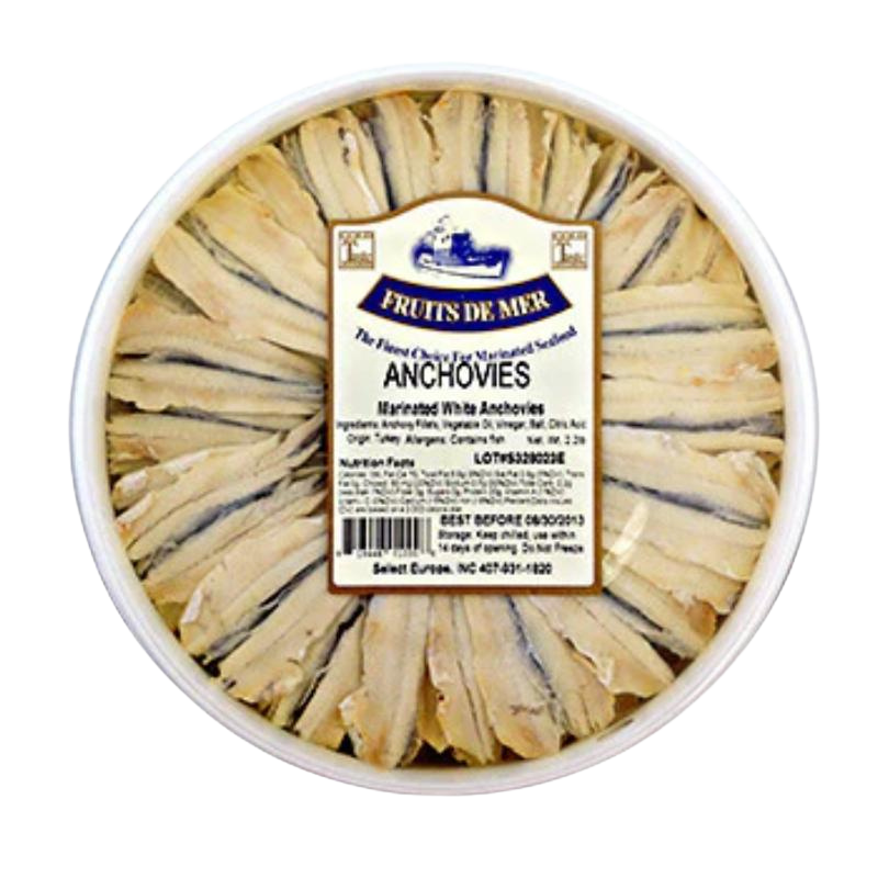 Marinated anchovy fillets in oil, these are typically white anchovies marinated in vinegar and oil, offering a milder flavor than salted anchovies.