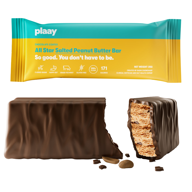 Enjoy the irresistible taste of Plaay’s Salty Peanut Chocolate Bar, made with our signature vegan dark chocolate blend and grass-fed whey protein. Each bite is filled with rich peanut butter and decadent chocolate chunks, rivalling classics like Reese’s and Snickers without any of the nasties. Not just a treat for your palate, Plaay’s chocolate bars also nourish your gut with balanced prebiotics and probiotics, promoting smooth digestion and overall gut health. Indulge anywhere, anytime, without compromise!